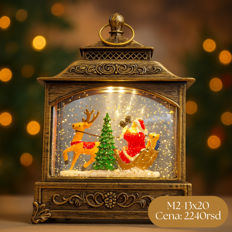 Zamisli ovo. Kasno je popodne. Jelka već okićena, svetla prigušena. U sobi polumrak i ona blaga tišina pred veče. Pored jelke – mali fenjer. Ne blješti, ne skreće pažnju na silu, samo tiho zasija onog trenutka kad ga uključiš. Unutra – mala zimska scena. Sneg polako kruži, šljokice plešu u tišini, a toplo svetlo ispuni prostor taman toliko da upotpuni prazničnu atmosferu. To je onaj momenat kad shvatiš: